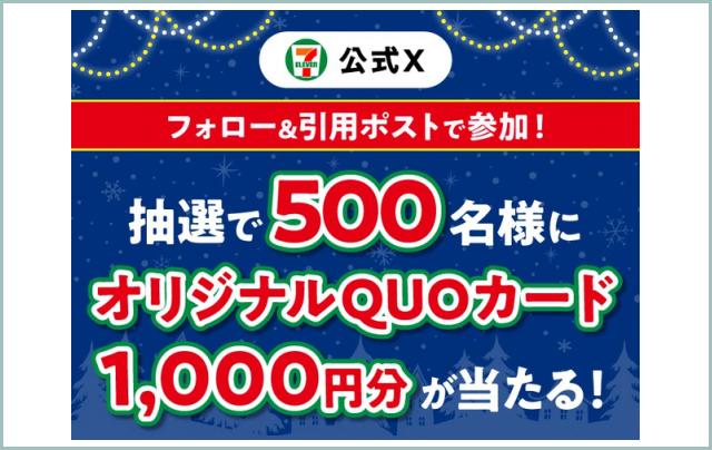 【セブン】Xキャンペーン実施!クリスマスデザインのQUOカード1,000円分が500名に当... N
